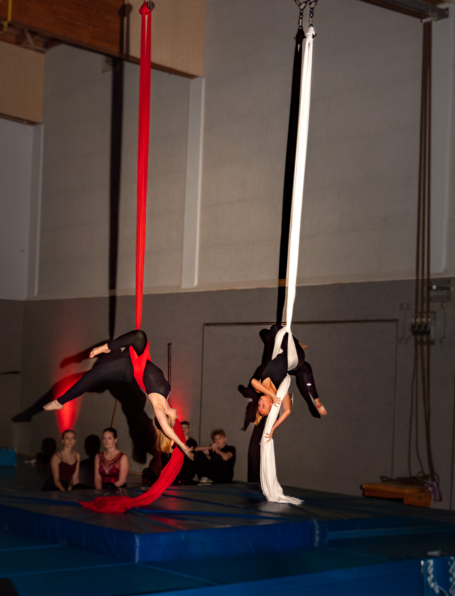 Den krönenden Abschluss bildete eine atemberaubende Vertikaltuchnummer, bei der die jungen Luftartistinnen das Publikum mit ihrer Kraft, Eleganz und ihrem Zusammenspiel in den Bann zogen.
