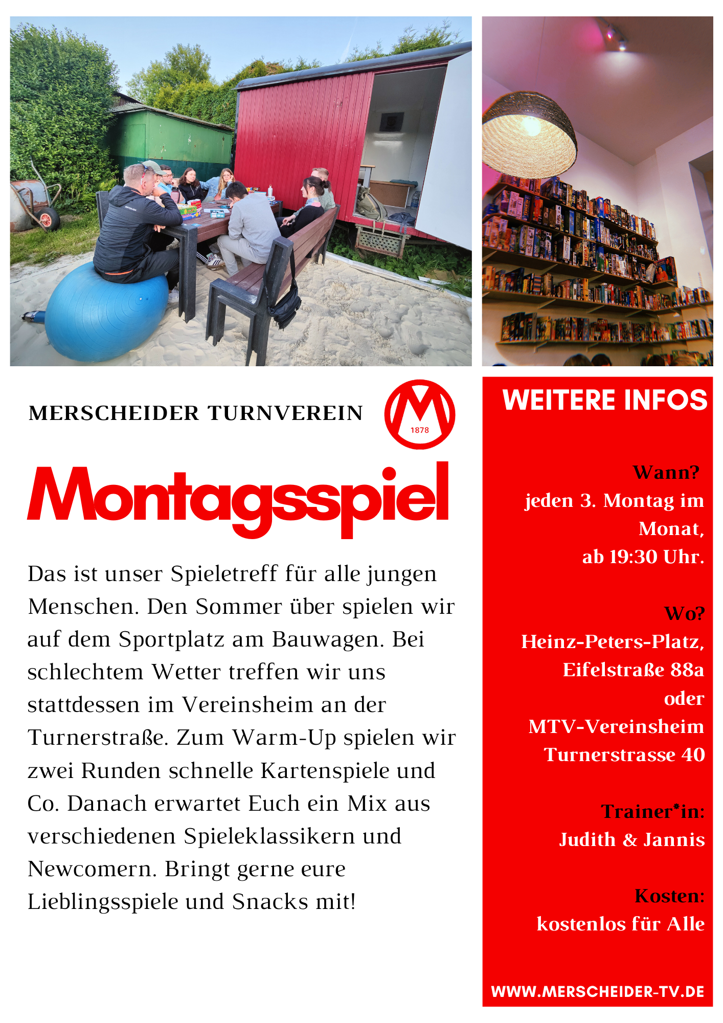 Hinter dem Montagsspiel verbirgt sich unser neuer Spieletreff für junge Erwachsene. Einmal im Monat treffen wir uns ganz ohne Sport zu machen und spielen gemeinsam verschiedenste Gesellschaftsspiele. Von einfachen Kartenspielen über Spieleklassikern bis hin zu komplexen Strategiespielen bei uns steht einiges zur Auswahl. Gerne könnt ihr auch euer Lieblingsspiel mitbringen und andere damit begeistern. Kommt einfach mal vorbei.